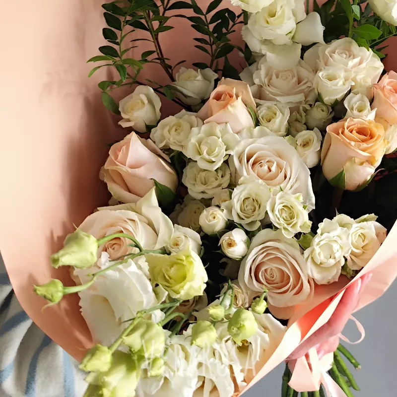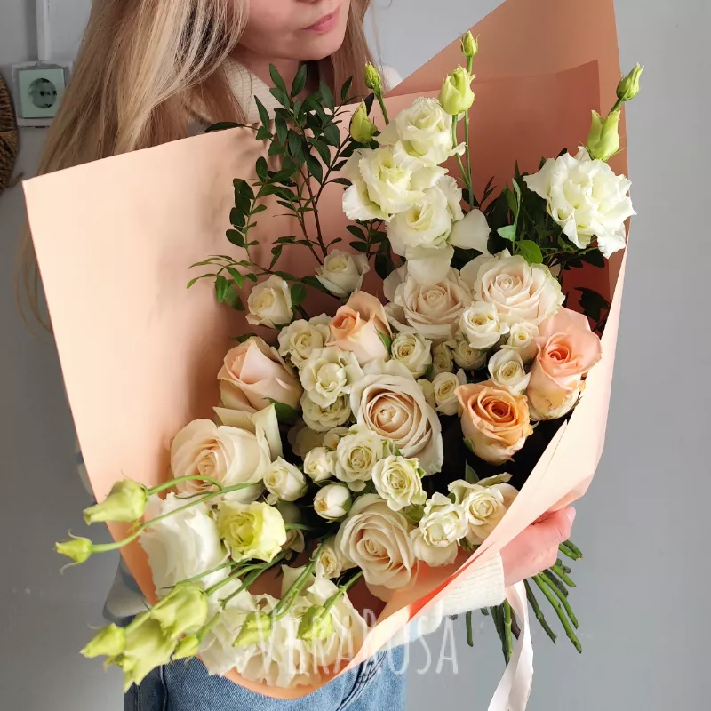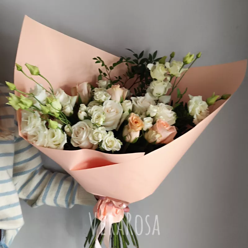 Нежный букет, состоящий из белых и персиковых роз, махровой экстомы, элегантно дополнен веточками зелени, создает атмосферу любви. Теплая цветовая гамма и текстура растений делают его особенно выразительным. Букет прекрасно подойдет для выражения искренних чувств и станет отличным подарком для самых близких людей.