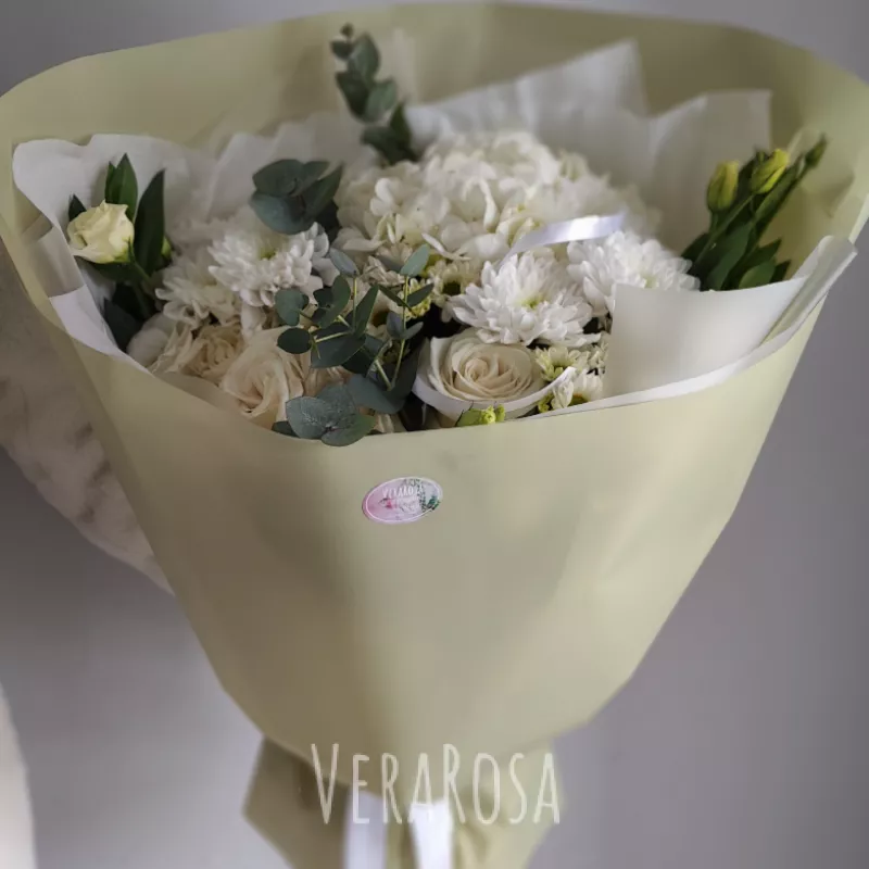 Нежный букет из mix кустовых хризантем, роз,,эустомы и зелени. Оформлен атласными лентами. В подарок мини открытка.