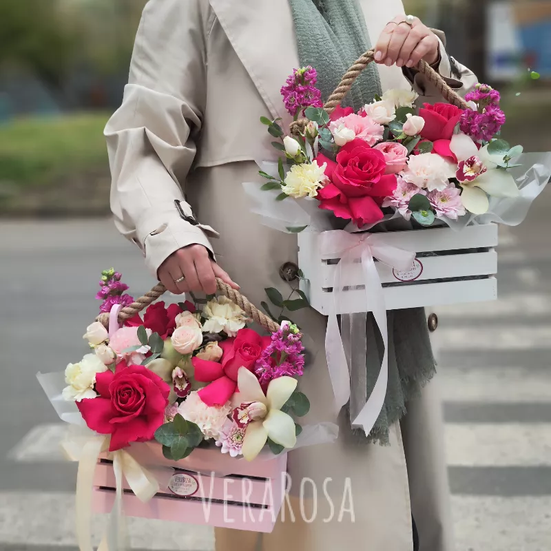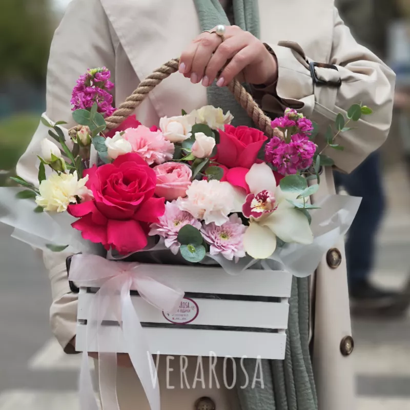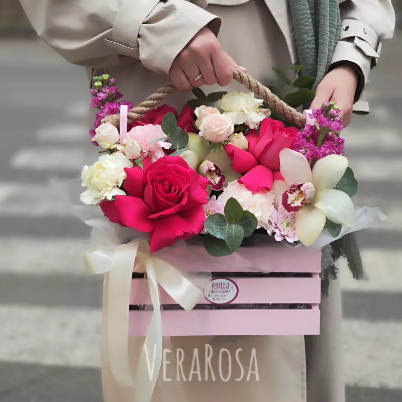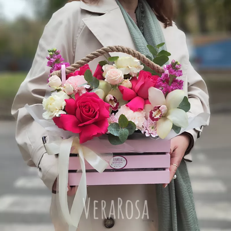 Яркая композиция из роз, медовой маттиолы,диантусов и веточек эвкалипта может быть выполнена в розовом или белом ящике. Оформлена атласными лентами.
